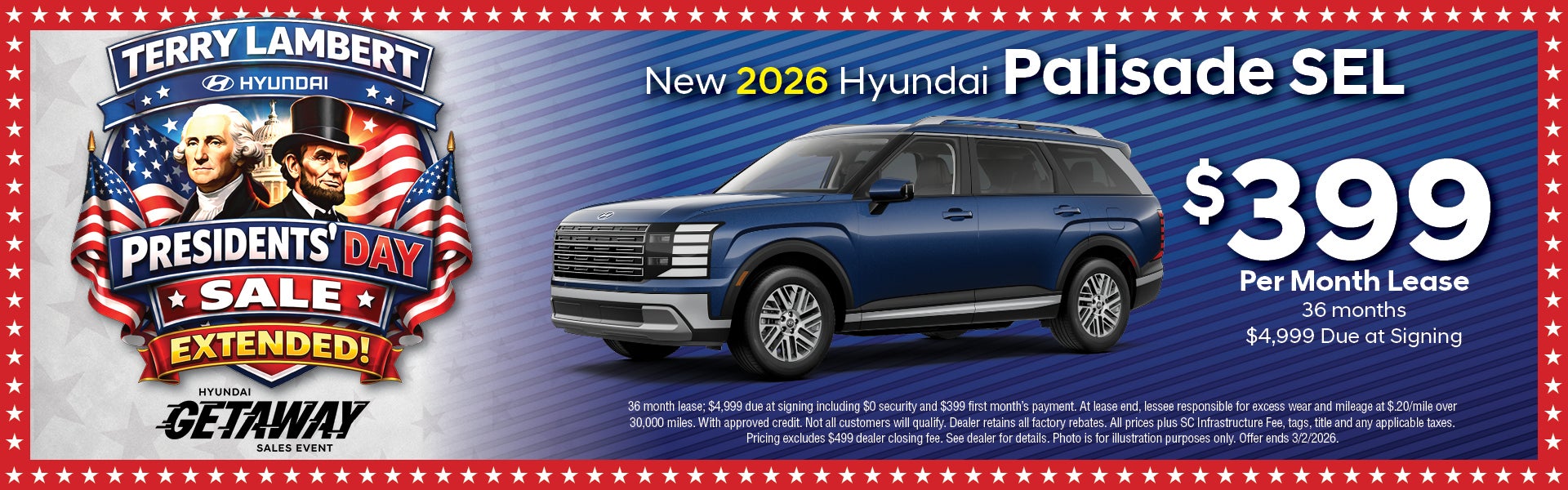 Consumer MUST bring a printed copy of Internet Price advertisements, if any, from website to dealer upon arrival at dealership before negotiations to qualify to receive any advertised prices, if any, when it is not an internet transaction provided the Internet Price offer has not changed or expired. Displayed Vehicle Price Offer(s) on this site, if any, are valid for internet customers/transactions only who mention the internet offer to the dealer upon arrival at the dealership. If a Vehicle Price Offer ("E-price" or "Internet Price" or similar description) is displayed on site, then these offers are valid for Internet customers/transactions only. MSRP is the suggested retail price set by the manufacturer not the Dealer's advertised price or selling price. Market conditions may cause the Dealer's sales price to be higher or lower than MSRP. All Internet pricing or Internet prices are subject to change without notice and all vehicles are subject to prior sale. Offers, if any, exclude SC Infrastructure Maintenance Fee, tags, title, applicable taxes, options added by the consumer, and Dealer’s $499 closing fee. The full cash price charged at any dealership depends on many factors, including all products and services bought with the vehicle. Dealer retains any and all Factory incentives and rebates on new vehicles. Dealer retains any and all factory/manufacturer/distributor and other incentives and rebates. No offers or discounts may be combined with any other offers or discounts. Additional features may have been added to enhance your enjoyment of a listed vehicle. You are not required, as a condition for the sale and delivery of a new vehicle, to purchase special features, appliances, equipment, parts or accessories that are not desired or requested. Please contact the dealership for additional details on any features or to see a vehicle without the dealer-added options. Dealer makes every reasonable effort to provide accurate and timely information, however, errors may occur; therefore, please understand that Dealer is not responsible for typographical, illustration, or pricing errors, incorrect equipment listed on any vehicle, or discrepancies in any statements of condition. Please verify information with a customer service rep. For In-Transit Inventory, any date of arrival is estimated. The actual date of delivery may vary due to circumstances beyond Hyundai and the dealer’s control. Please contact your local Hyundai dealer for availability details.
